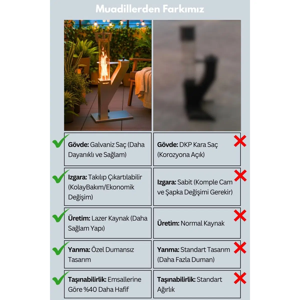 Kokusuz ve dumansız çalışma sistemi sayesinde kapalı ve yarı açık alanlarda güvenle kullanılabilir. Füze tipi cam tasarımı, alevleri net şekilde göstererek ortama güçlü ve estetik bir ambiyans katar. Kolay kurulum, pratik kullanım ve yüksek ısı verimliliği sunar.